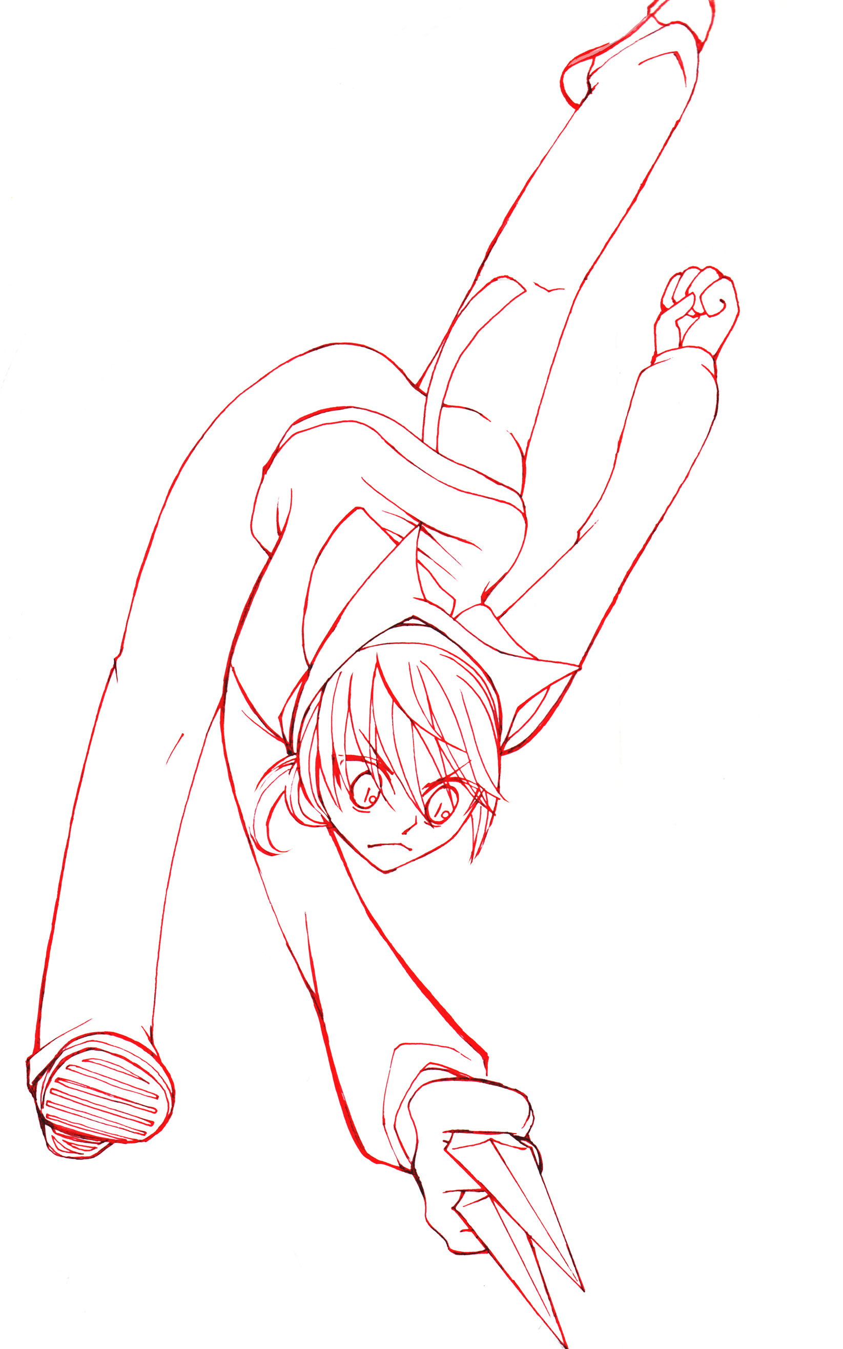 ぐちゃっとラフ描いてイメージ固めて、これだ!てのを清書。ポーズ集とか見ながら実在のアクションさせてたはずが、結局お顔と武器を見せたいというの優先で架空のポーズに。