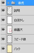レイヤー数は、メインの喜虎に19枚、他5枚の計24枚です。 いつもは名前つけないけど今回は描くレイヤーの役割が見て推測できるように日本語名つけました。