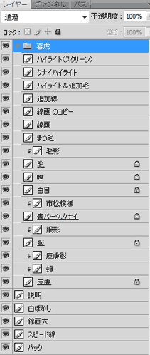 ・ハイライトは線画よりも上にレイヤーを作って白や薄い色を乗せます。一部スクリーンで重ねている所もあります。 ハイライトのレイヤーで動きを出す為の毛が追加されたりしてます。