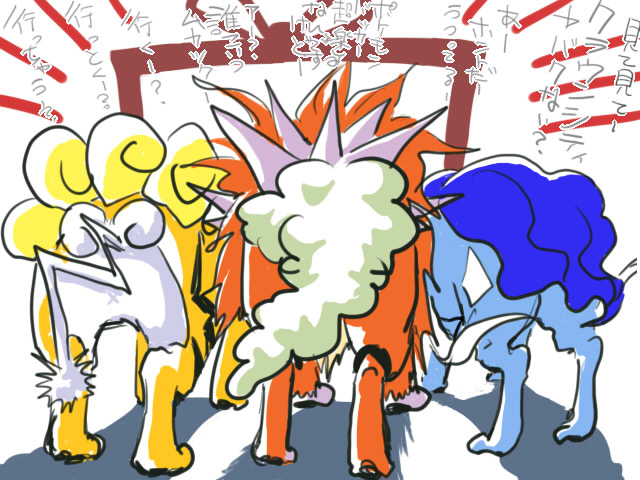 さてそんで、今回ゾロアークを悪いと思って攻撃した伝説三犬。何か勘違いの仕方がテレビ見て来たとしか思えなかったので落書きしてみました(笑)