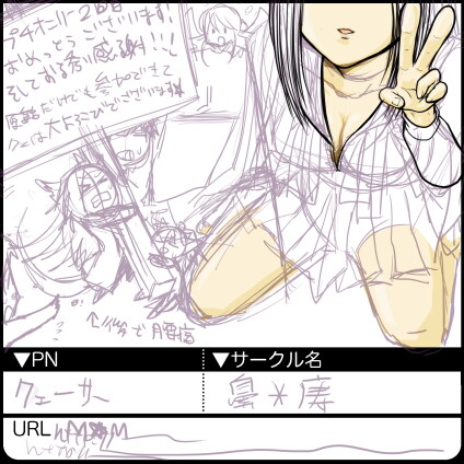やっぱり女性向け描く人たちって、BLに耐性があっても男性向けは苦手だったりするじゃないですか…、うん、良かった。やめといて良かった。後、サークル名は不参加のが書いてあるとややこしいと思ったんで提出したカットには書いてません。
